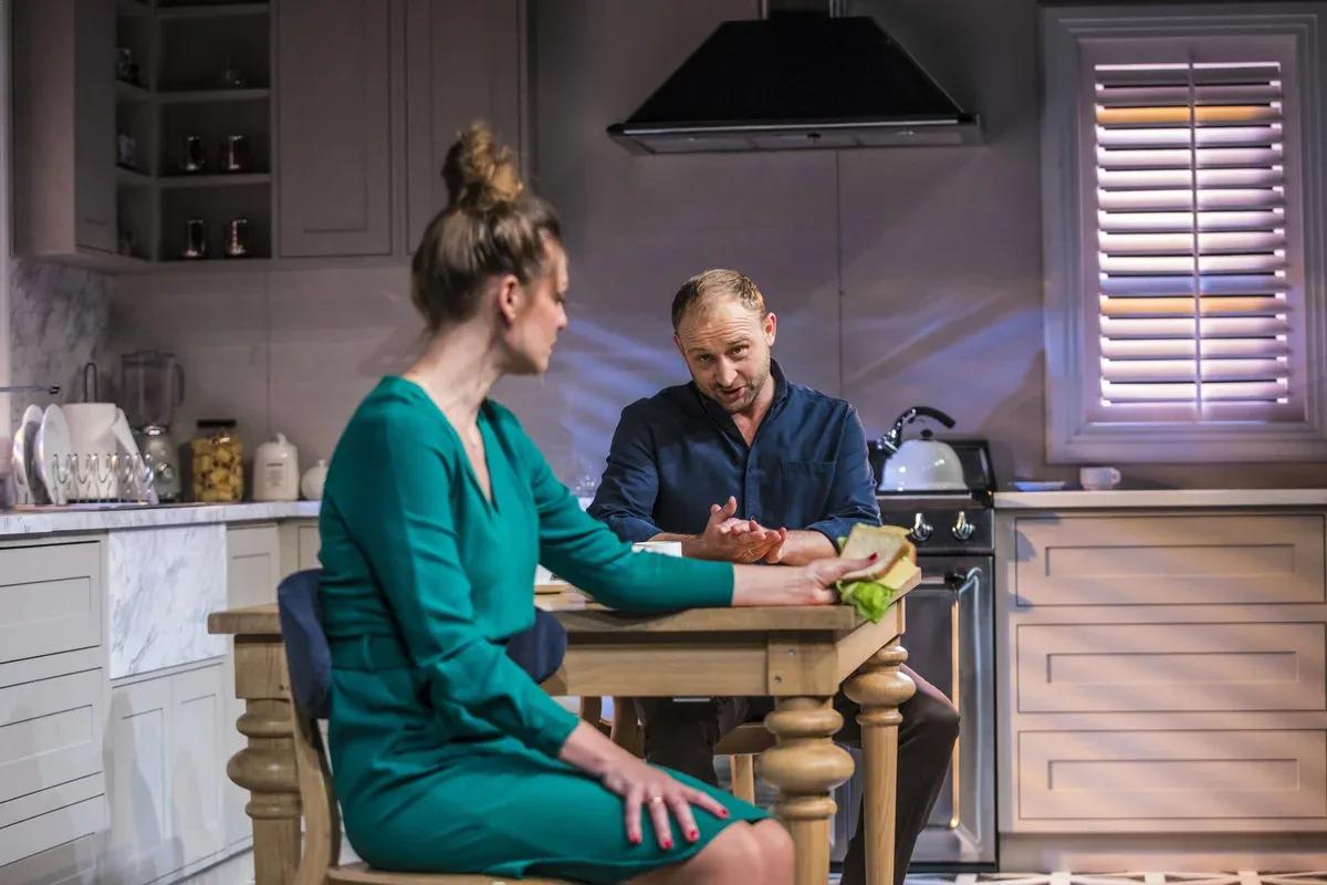 Do tego dochodzi światło. Nie jest przypadkowe – raz ociepla przestrzeń, raz wydobywa jej chłód. W jednej chwili robi się przytulnie, w następnej klaustrofobicznie, jakby kuchnia zaczynała zamieniać się w więzienną celę. Dzięki temu widz doświadcza emocji bohaterów nie tylko przez dialog, ale i przez atmosferę, którą buduje scenografia.